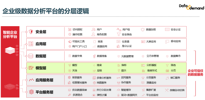 语义层是指在BI平台中搭建一个模型层,把数据仓库的数据映射成统一的业务术语,为企业级数据分析创建统一的逻辑数据模型。主要包括统一的维度(比如时间、客户、产品、组织),统一的指标(比如销售、收入、达成率%),同时一些衍生指标,比如同比、环比、月累计、年累计也可以在语义层维护。