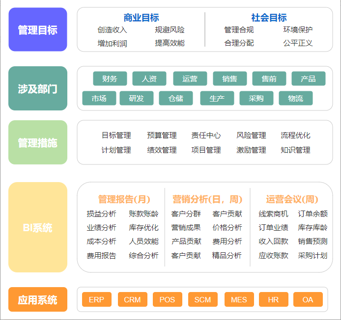 企业为达到利润最大化,管理者需协调各职能部门,让各部门齐心协力地创造收入,节约成本,提高效能,把控风险。为保证流程一致性并收集作业环节中的所有资料,企业引入了CRM、ERP、MES、HR、OA等业务系统;为更好保证目标达成,引入了各种管理措施包含KPI,MBO和OKR管理、计划管理(包含预算和预测)、绩效管理、CMMI、ISO流程标准等。