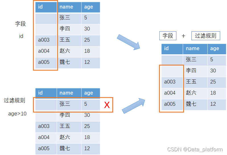需要对id字段做校验,且需要将age<10的用户过滤掉,即圈定出目标数据: