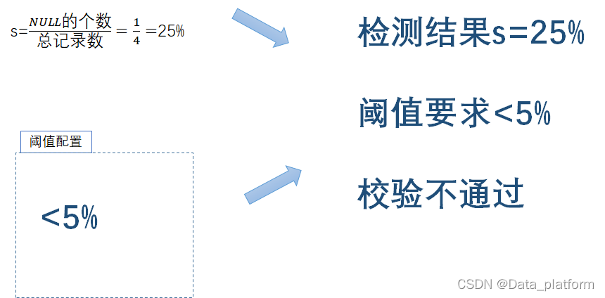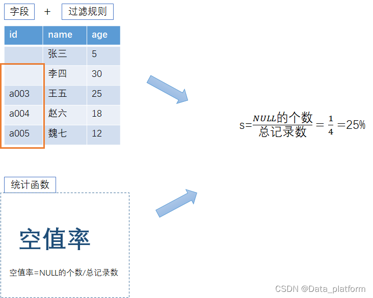 用户需要对该表配置如下的规则: age>10的这些用户,检测id字段为空的数据量占比不能超过5% 。