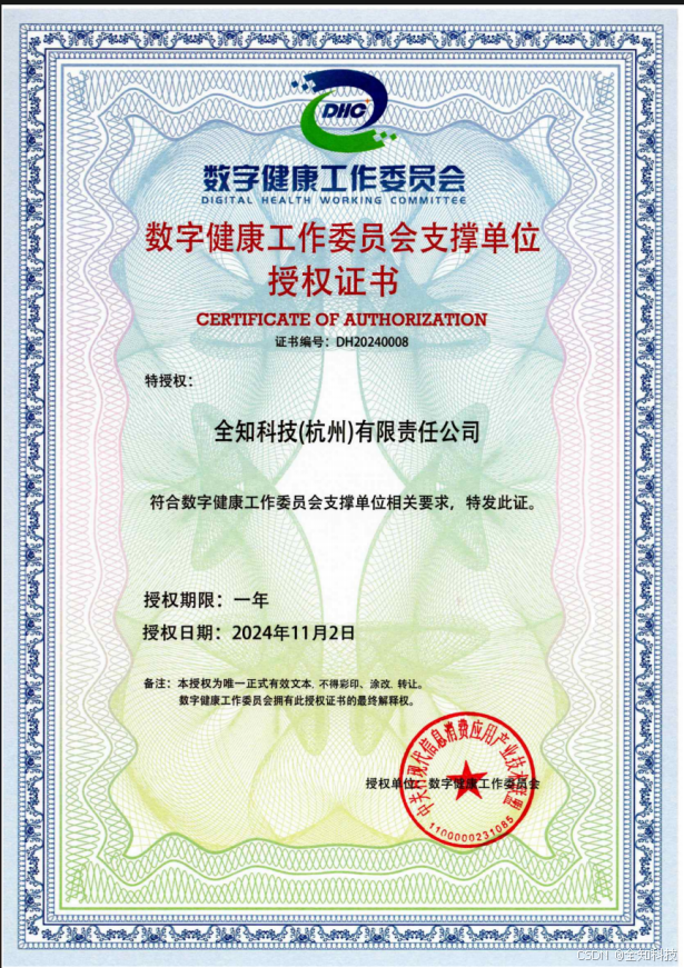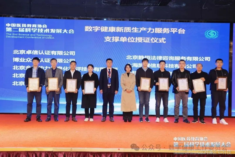 为落地数字健康新质生产力服务平台项目以及推动数据安全和个人信息保护工作的合规发展,经过严格筛选,“数健委” 授予了包括全知科技(杭州)有限责任公司在内的九家企业 “数健委支撑单位”的称号。在颁证环节,中国医药教育协会张福会长与数健委外联部蔺睿琪主任为这九家数字健康项目的支撑单位颁发了证书。