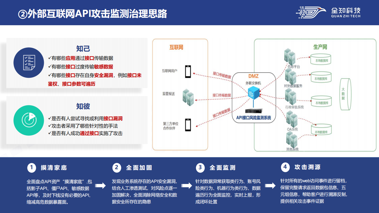 在会议交流中,针对企业如何打破数据治理困境,全知科技售前经理陈崇滨分享了 “金融监管下的API数据安全” 实践经验,提出了以数据分类分级为治理基石、API全方位防护为抓手、一体化风险监测平台为落点的数据流动安全治理思路。