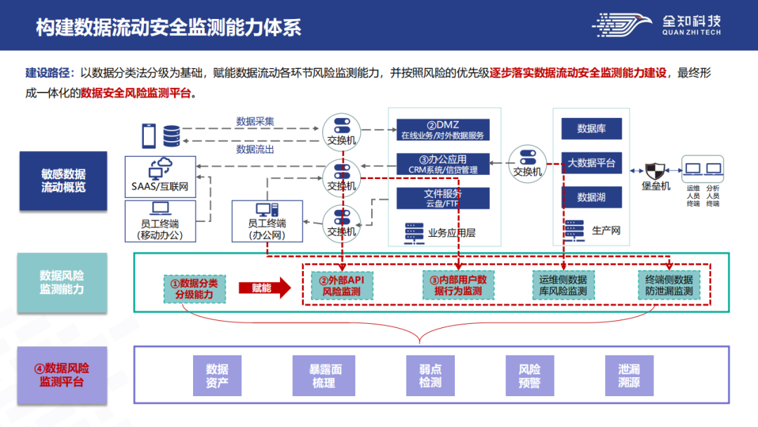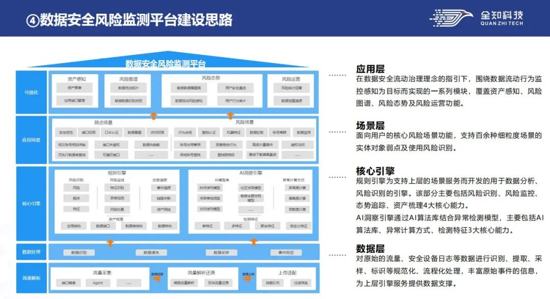 以数据分类分级为基础,逐层构建应用、场景、引擎与数据四位一体的风险监测体系,最终形成一体化数据安全风险监测平台。