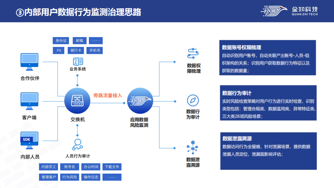 账号权限梳理:自动识别用户账号,关联产出账号-人员-组织架构,识别数据访问特征与数据量;