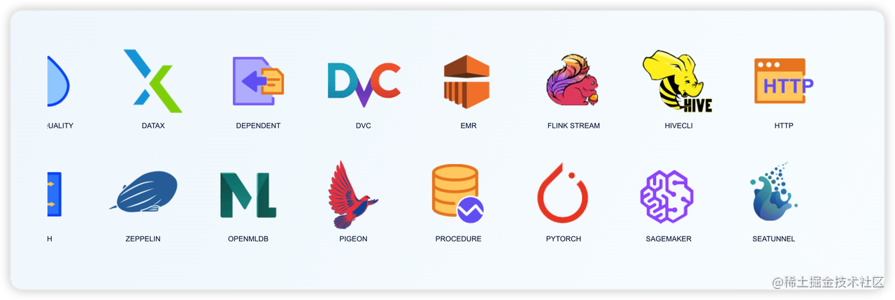 Apache DolphinScheduler 是一个分布式和可扩展的开源工作流协调平台,具有强大的DAG可视化界面。支持 30+ 的任务类型,包括像 Flink SQL、DataX、HiveCli 等。能够高并发、高吞吐量、低延迟和稳定地执行百万个量级任务,可以根据计划时间(特殊日期范围或特殊的日期列表)批量执行任务,而且在不影响工作流模板的情况下,工作流实例支持修改、回滚和重新运行。