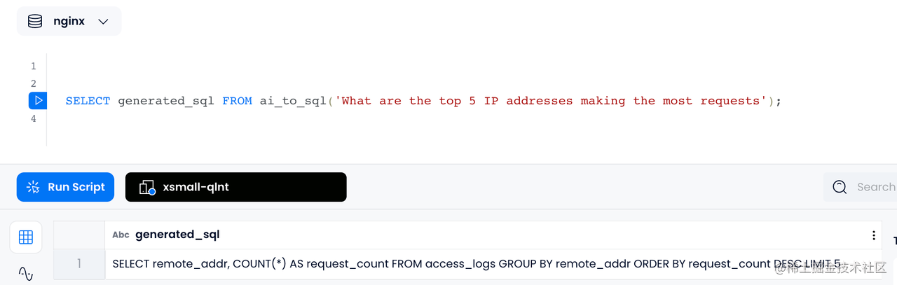 比如,如果你在一个 nginx log 的数据库中提问:"What are the top 5 IP addresses making the most requests",运用 Databend 的 AI_TO_SQL 函数,你将直接得到相应的 SQL 语句,使用非常便捷。