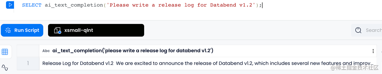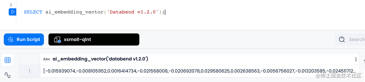 Databend 在 v1.2.0 版本引入了强大的 AI 功能,实现了 Data 与 AI 的无缝融合,我们可以通过 SQL 来实现:
