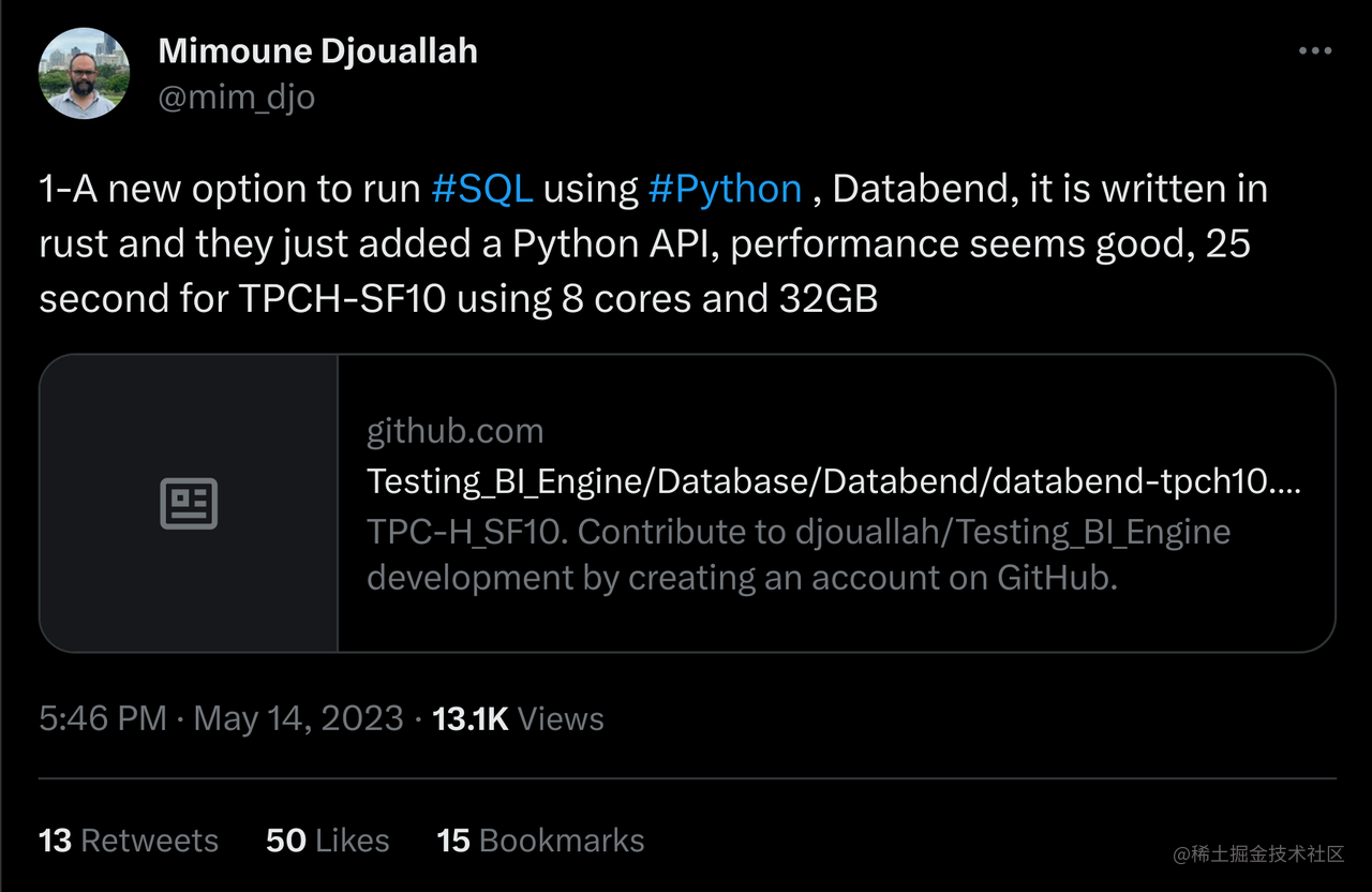 商业智能分析师 Mimoune Djouallah 评论称:Databend 性能出色,在 8 核和 32GB 内存的条件下,运行 TPCH-SF10 只需要 25 秒。他甚至撰写了一篇题为《Databend and the rise of Data warehouse as a code》的博客文章。