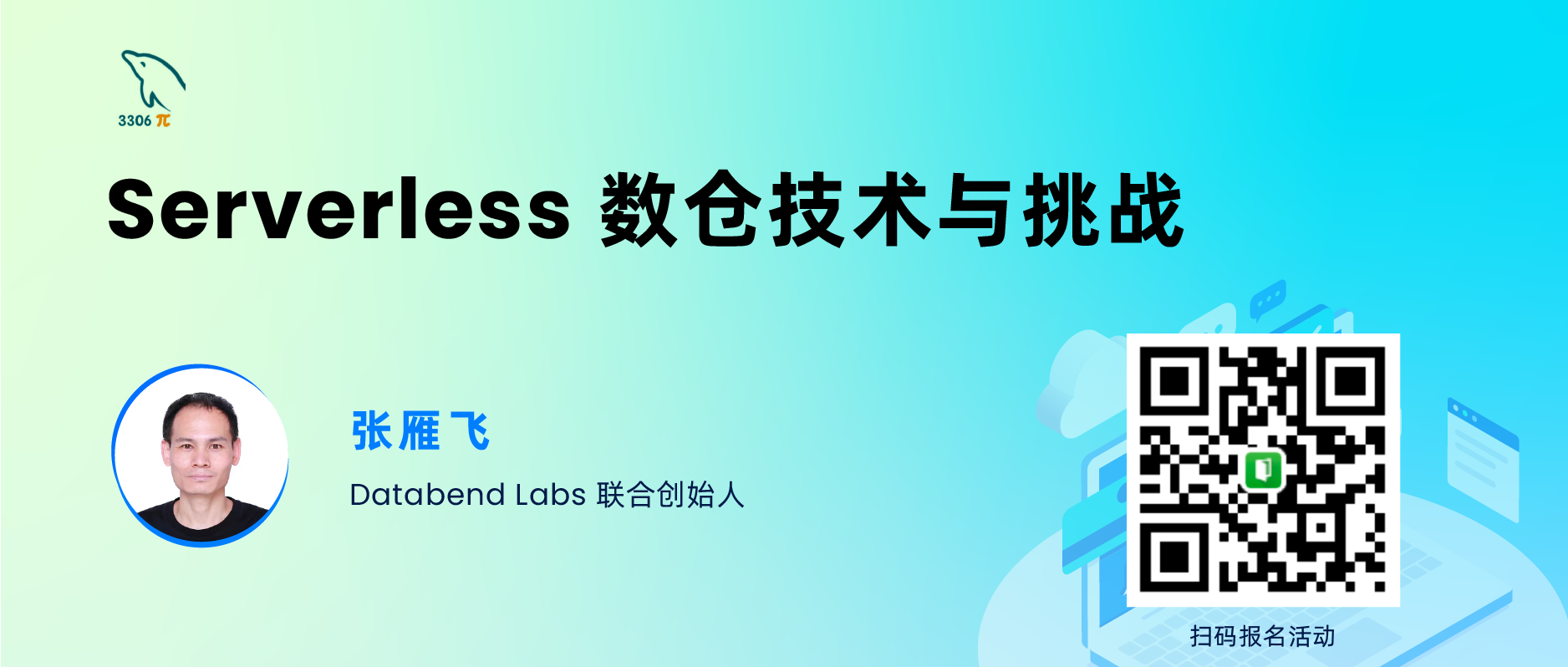 09月16日(本周六)下午,Databend Labs 联合创始人张雁飞将作为嘉宾参与由 3306π 组织的「 3306π 数据库朋友圈」主题分享。