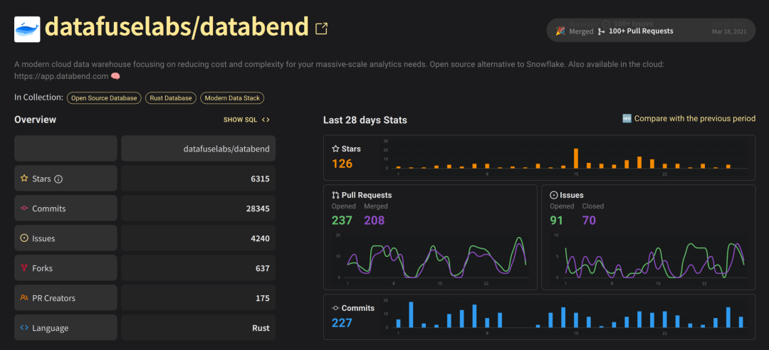 高效 的研发 : 虽然 Databend 从第一版发布至今只有 2 年多,但从开源到文章撰写时为止,已经累计有 8000 多个 PR 。
