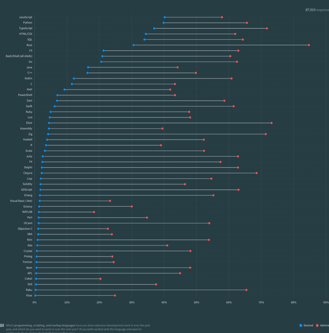 正因为 Rust 语言表现力、卓越的性能以及自己独有一套的内存管理方式,蝉联八届 Stack Overflow Developer Survey 最受程序员推崇的语言。