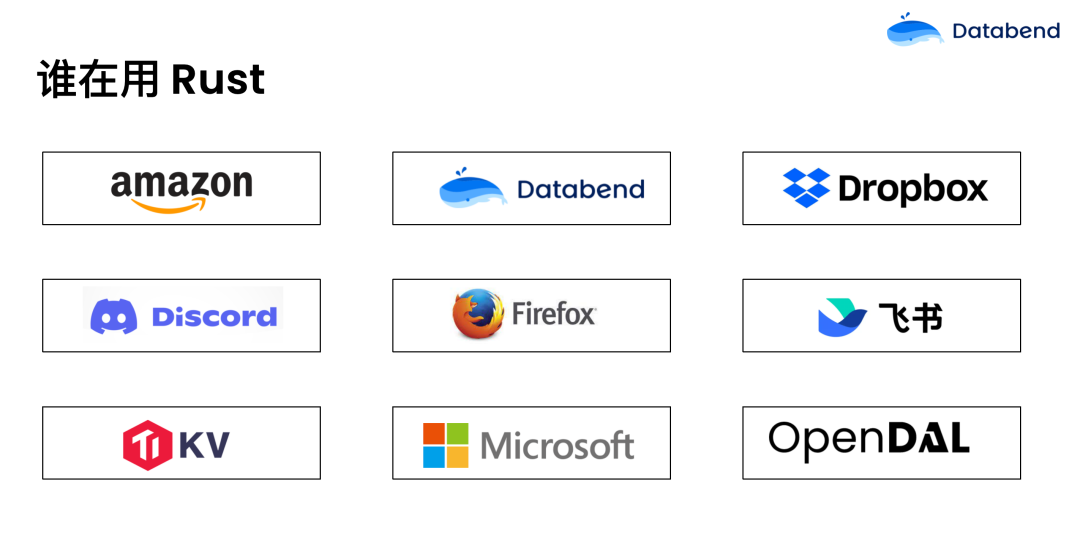 新时代基础设施是指:可以在云上自由部署、与云完美融合的基础设施。在这个新时代中,Databend 和一些数据库同行都选择了 Rust 作为首选语言。我们可以观察到 amazom、 微软、Firefox、飞书、TiKV、云数仓 Databend、OpenDAL 等公司或者项目在使用 Rust 。