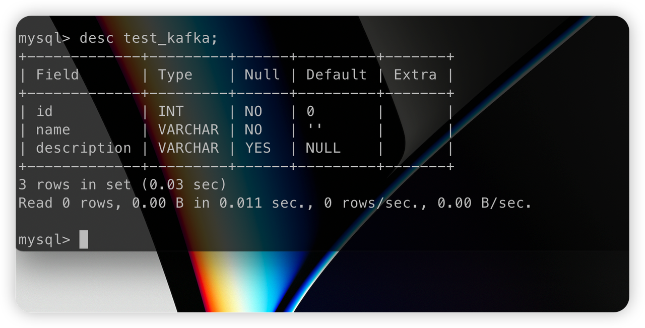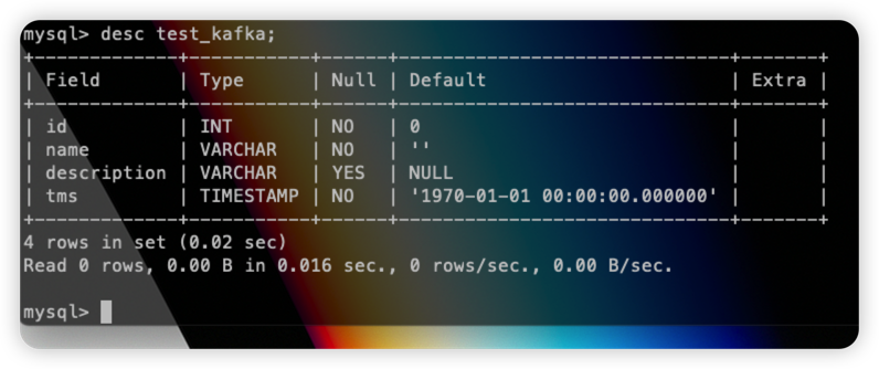 在 MySQL 中创建数据库 mydb 和表 test_kafka: