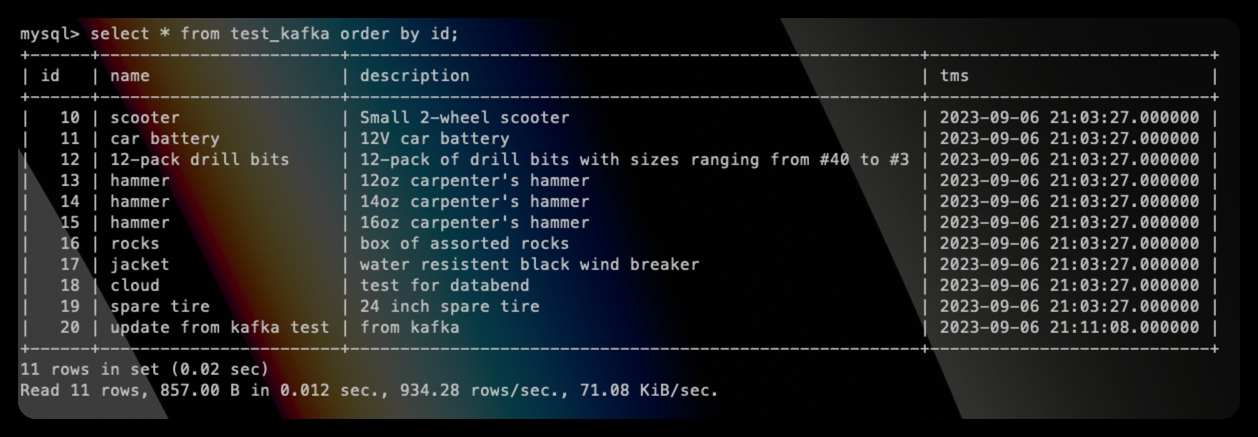 update test_kafka set name="update from kafka test" where id=20;