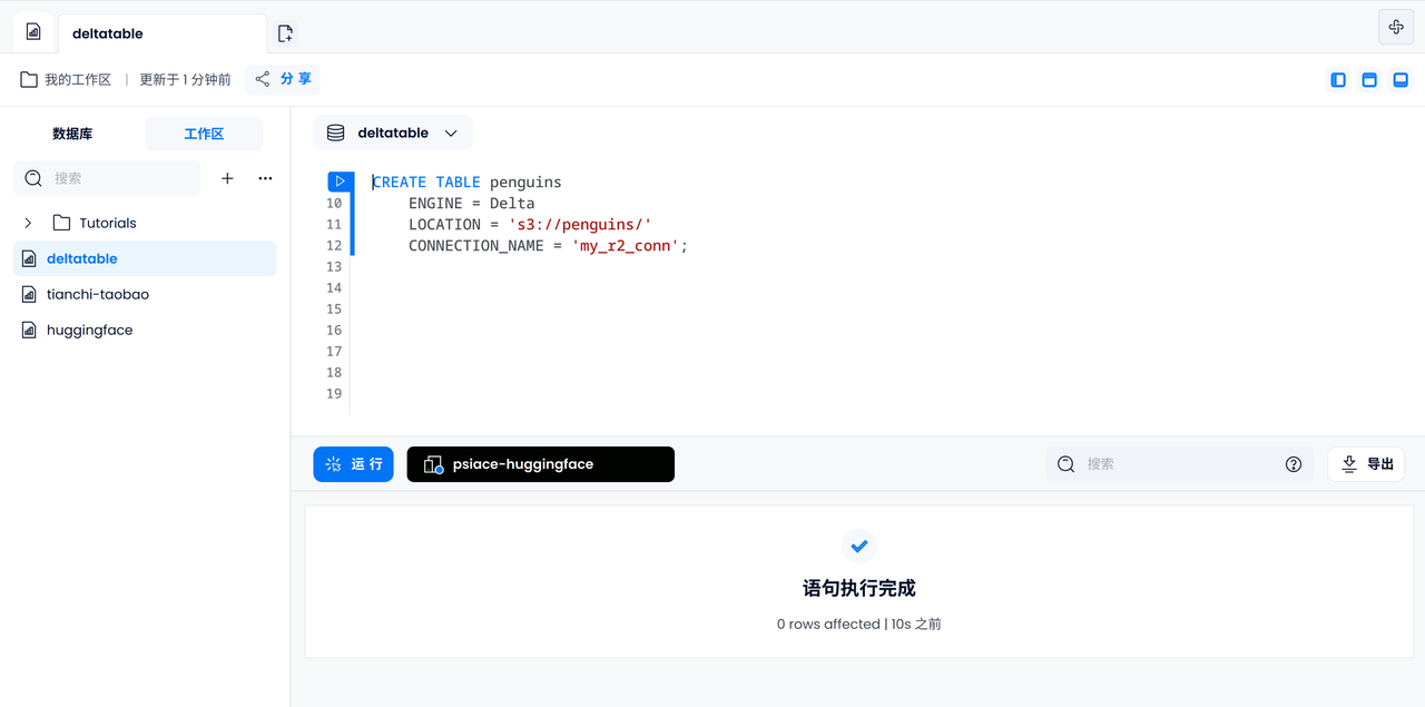 -- Create table with Open Table Format engine CREATE TABLE penguins ENGINE = Delta LOCATION = 's3://penguins/' CONNECTION_NAME = 'my_r2_conn';
