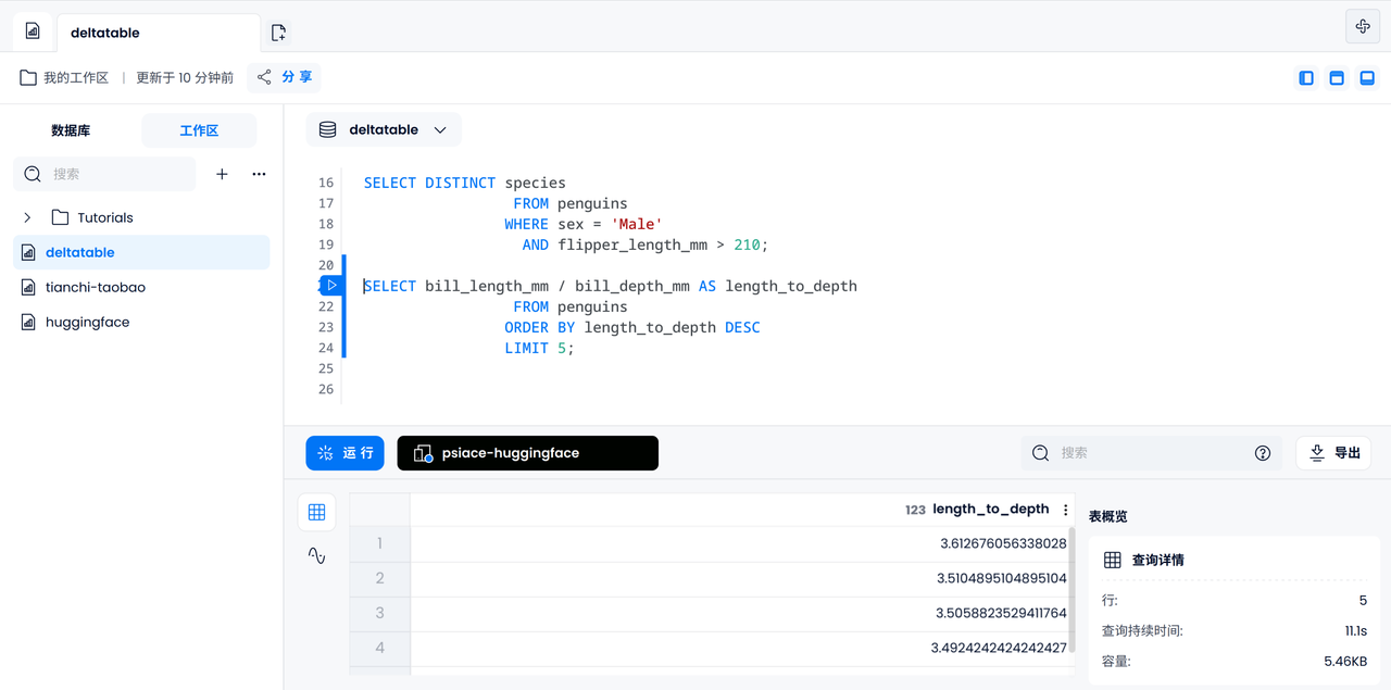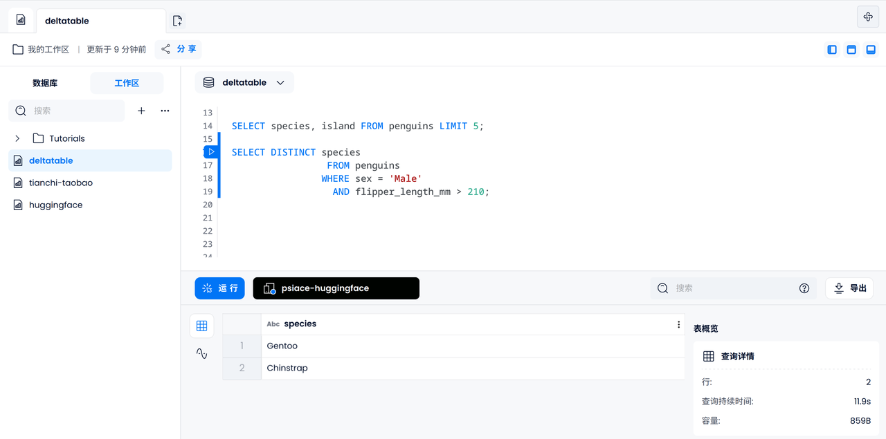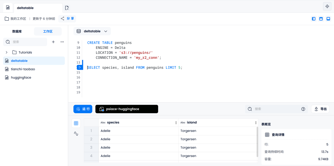 首先,让我们输出 5 个企鹅的种类和所在的岛屿,以检查是否能够正确访问到 Delta Table 中的数据。