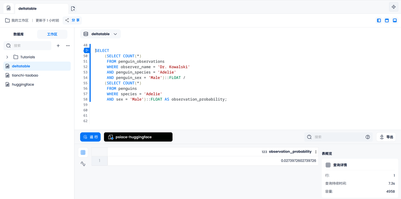 现在将会进入一个有趣的部分:假设我们发现了科考站的一份观察记录,让我们尝试在同一个数据库下录入这份数据,并且尝试进行一项简单的数据分析:某只特定性别的企鹅被某位科学家标记的概率是多少。