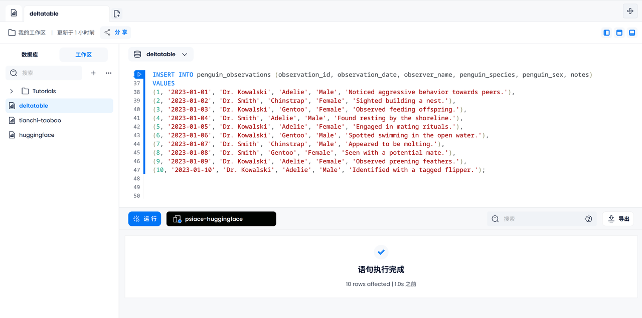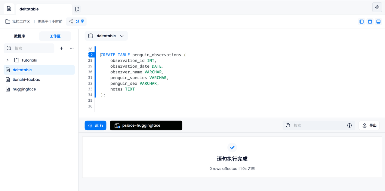 使用默认的 FUSE 引擎创建 penguin_observations 表,包含 ID、日期、姓名、企鹅种类与性别、备注等几类信息。