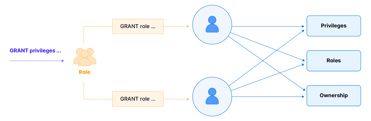- 所有权只能授予角色;不允许将所有权授予用户。一旦从一个角色转移给另一个角色,所有权就转移到新角色。