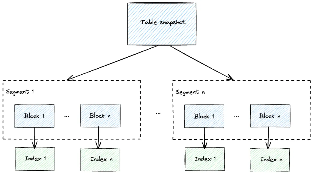 Databend 一个表的数据会分为若干个 segments,并在每个 segment 内进一步分为多个 blocks,这样的设计有利于并行处理和查询数据,从而提高整体的处理速度和响应性能,使得 Databend 能够处理大规模数据集,提供高性能的数据处理和查询能力,并保证数据的可靠性和可用性。在生成索引数据时,我们会为每个 block 生成一个单独的索引文件,相比于包含多个 block 的大索引文件,单独索引的设计有如下的优点:
