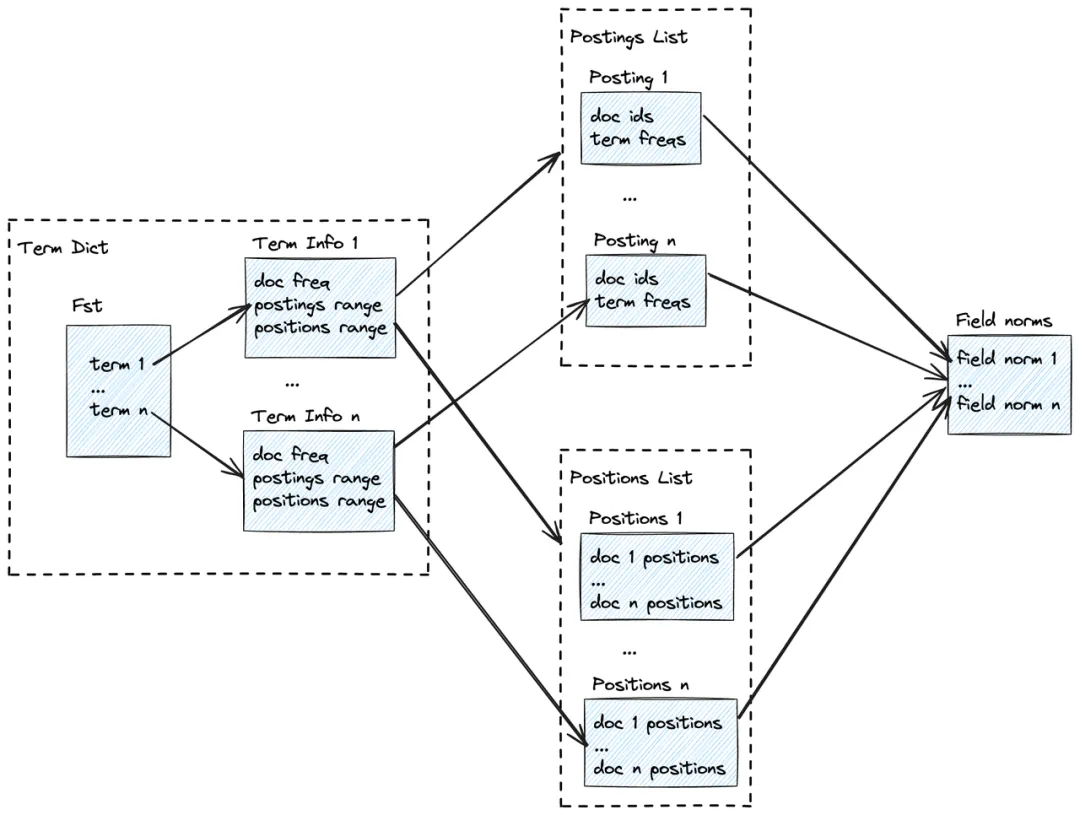 倒排索引的最主要功能是通过一个查询词(Term)找到相关的信息(TermInfo),通常使用 FST(Finite-State Transducer) 构建倒排词典(Term Dict)来实现这个功能。在构建倒排 FST 时,为每个 Term 创建一个状态,并将 TermInfo 作为输出符号附加到该状态。在查询时,给定一个 Term ,可以在 FST 中找到与之对应的最终状态,并从该状态中提取出相应的 TermInfo。关于 FST 更详细的原理可以参考这篇文章的介绍。