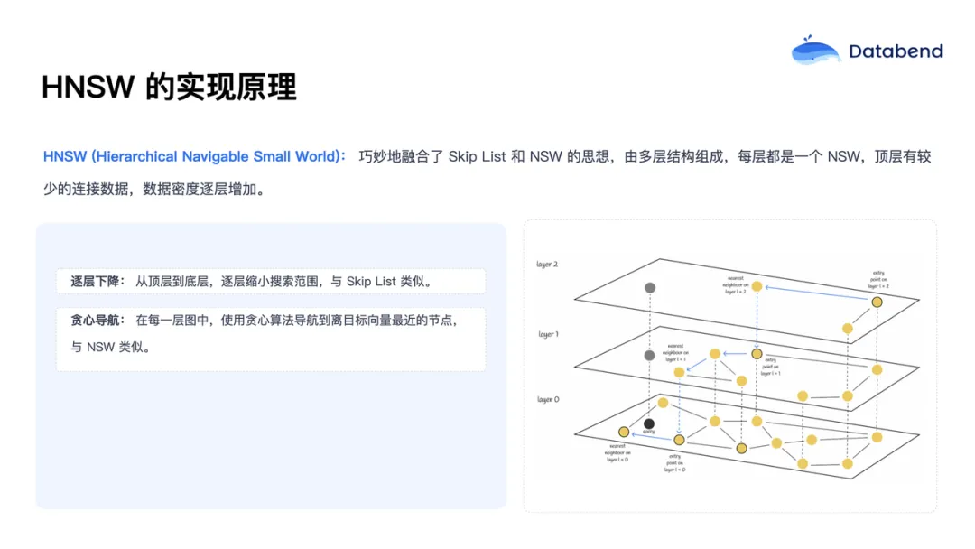 为了将这些非结构化数据转化为计算机可处理的形式,通常需要使用大模型对数据进行处理,将其转换为数字化的向量。这些向量能够捕捉原始数据的各个维度信息,为后续分析和应用奠定基础。然而,传统数据库主要针对结构化数据设计,对于向量数据的处理能力有限,无法高效地存储和索引。为满足新需求,越来越多的数据库开始支持向量数据,并通过索引技术加速相关查询。Databend 同样支持向量数据,能够实现高性能的检索。