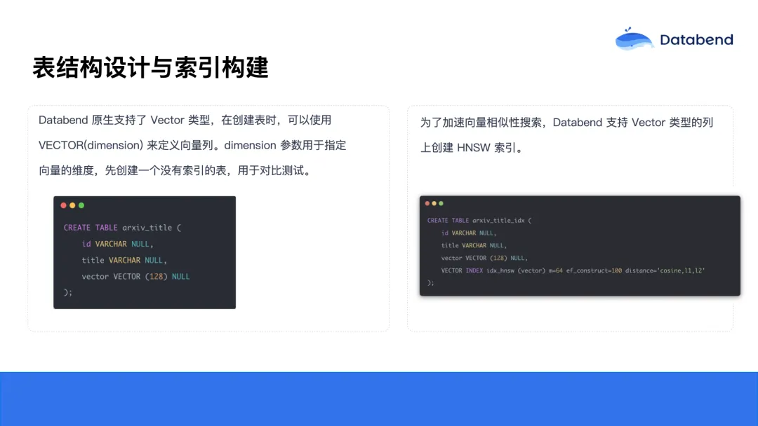 第一步、表结构设计。 得益于 Databend 原生支持向量类型,我们可以直接将向量数据定义为 vector 字段,同时增加如 ID、title 等描述性字段,以提升数据可观测性。此外,还需要选择合适的索引类型,并通过参数调优优化性能。
