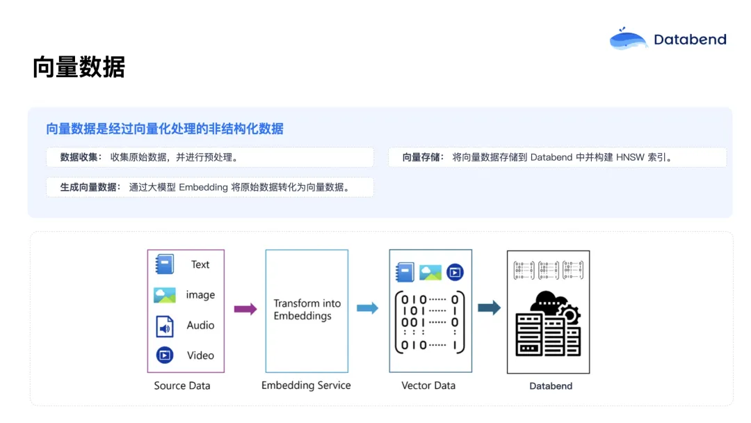 为了将这些非结构化数据转化为计算机可处理的形式,通常需要使用大模型对数据进行处理,将其转换为数字化的向量。这些向量能够捕捉原始数据的各个维度信息,为后续分析和应用奠定基础。然而,传统数据库主要针对结构化数据设计,对于向量数据的处理能力有限,无法高效地存储和索引。为满足新需求,越来越多的数据库开始支持向量数据,并通过索引技术加速相关查询。Databend 同样支持向量数据,能够实现高性能的检索。