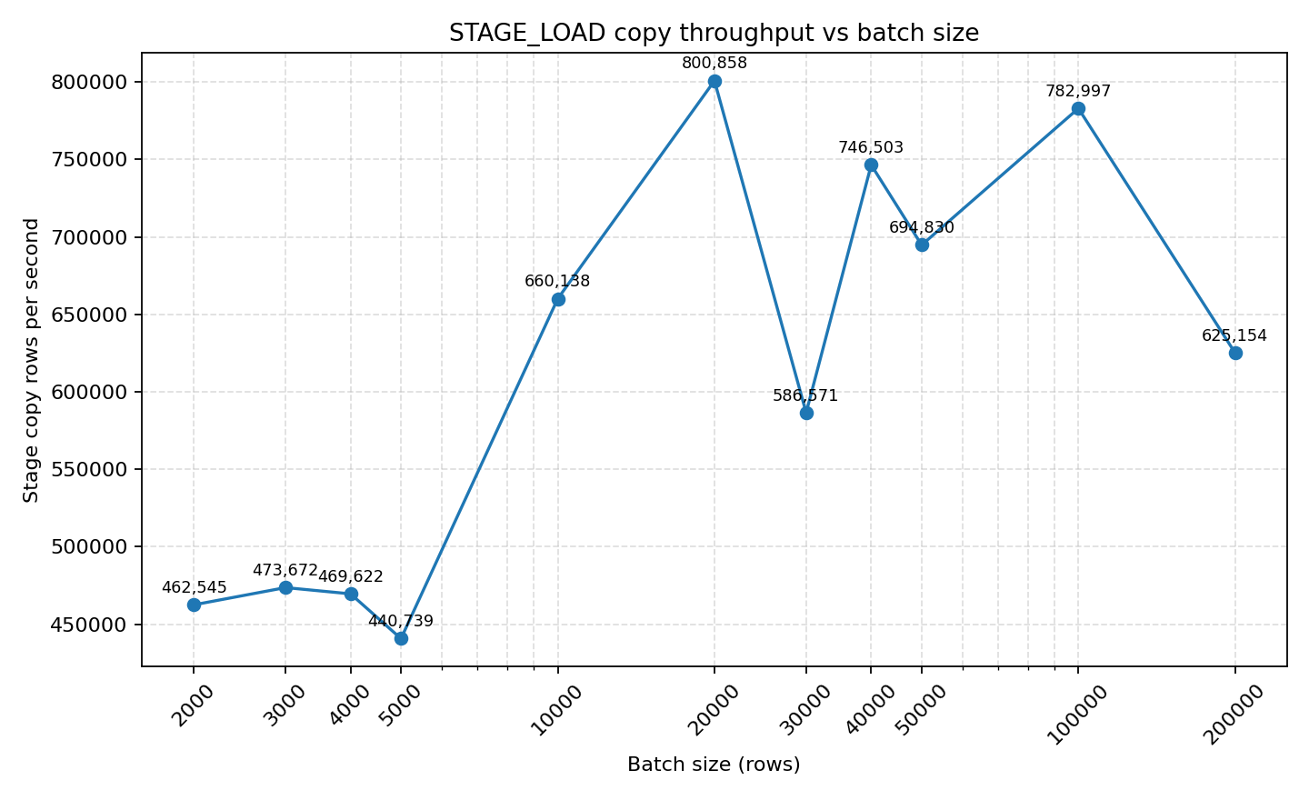 STAGE_LOAD 的 COPY throughput 处于另一个量级:batch=20k 时即达到 800k rows/s,50k 批稳定在 694k rows/s。整个阶段的总耗时受 stage 写入 + copy 启动占比影响更大,但单次 COPY 的吞吐无可比拟。 关键发现: