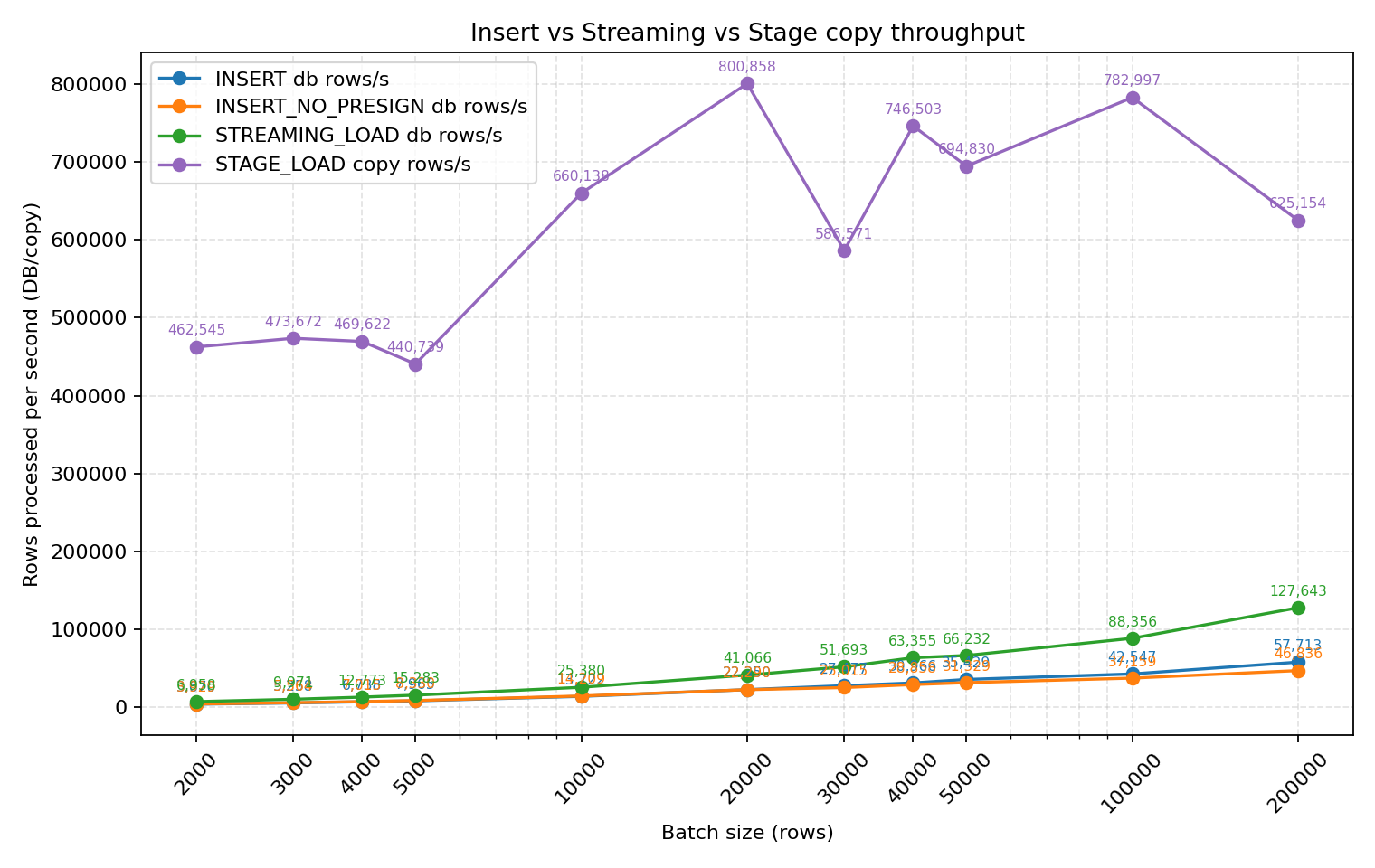 STREAMING_LOAD 的 DB 吞吐随着 batch 增大快速提升,从 2k 批的 6,958 rows/s 提升至 200k 批的 127,643 rows/s,明显优于同批次的 INSERT(29,283 rows/s)和 INSERT_NO_PRESIGN(26,121 rows/s)。