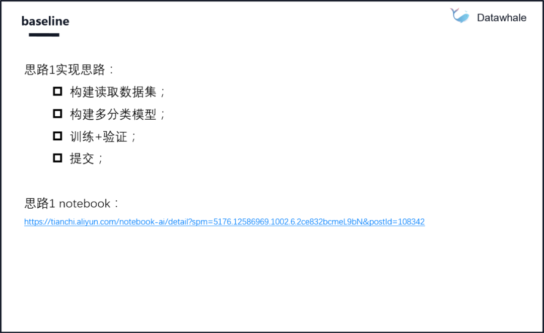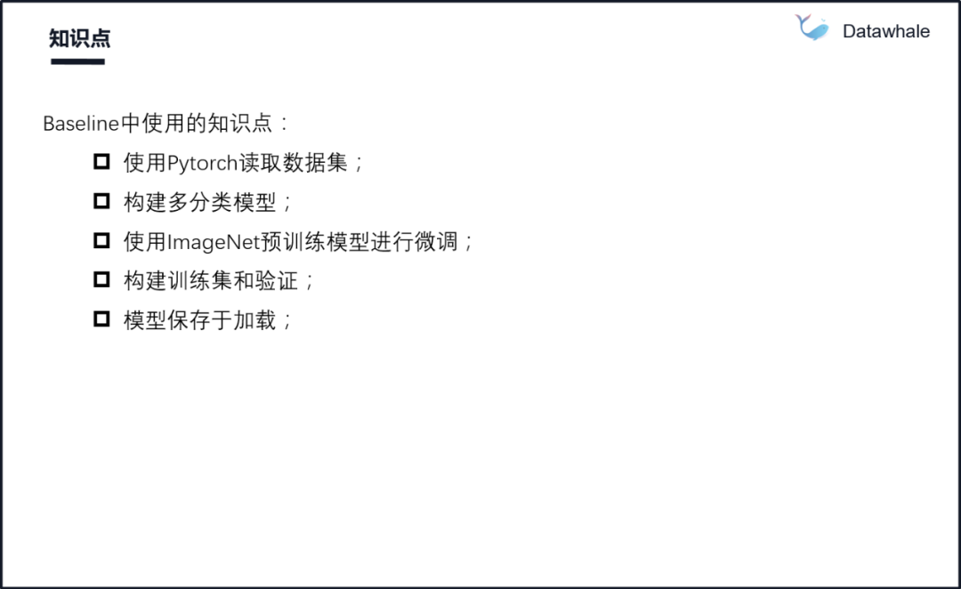 Baseline中涉及读取数据、构建模型、预训练模型、验证模型等知识点,这些在比赛中都是必不可少的操作。