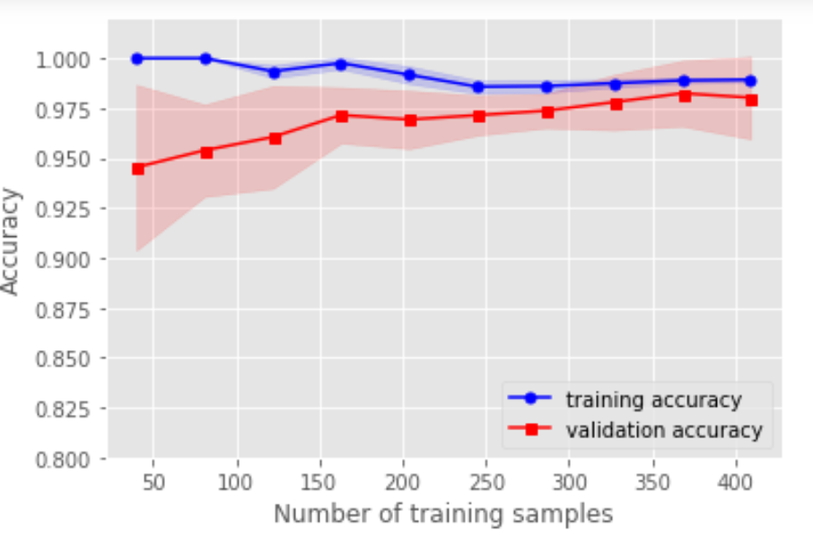 plt.fill_between(train_sizes,test_mean+test_std,test_mean-test_std,alpha=0.15,color='red')
