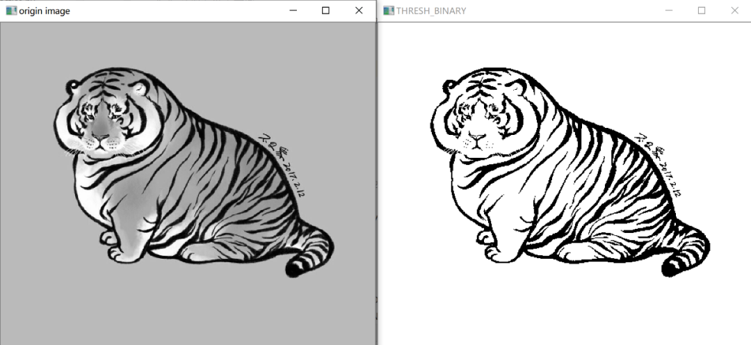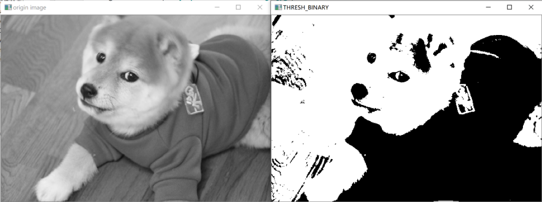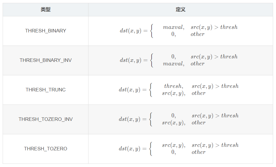 THRESH_BINARY;二值化阈值处理:灰度值大于阈值的点,将其灰度值设定为最大值,灰度值小于或等于阈值的点,将其灰度值设定为0
