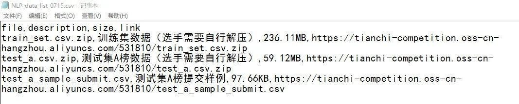 步骤2:打开所下载的文件,发现下载的并非是数据集本身,而是提供了训练集数据,测试集数据,sub提交样例的下载链接。