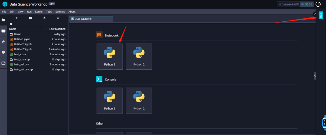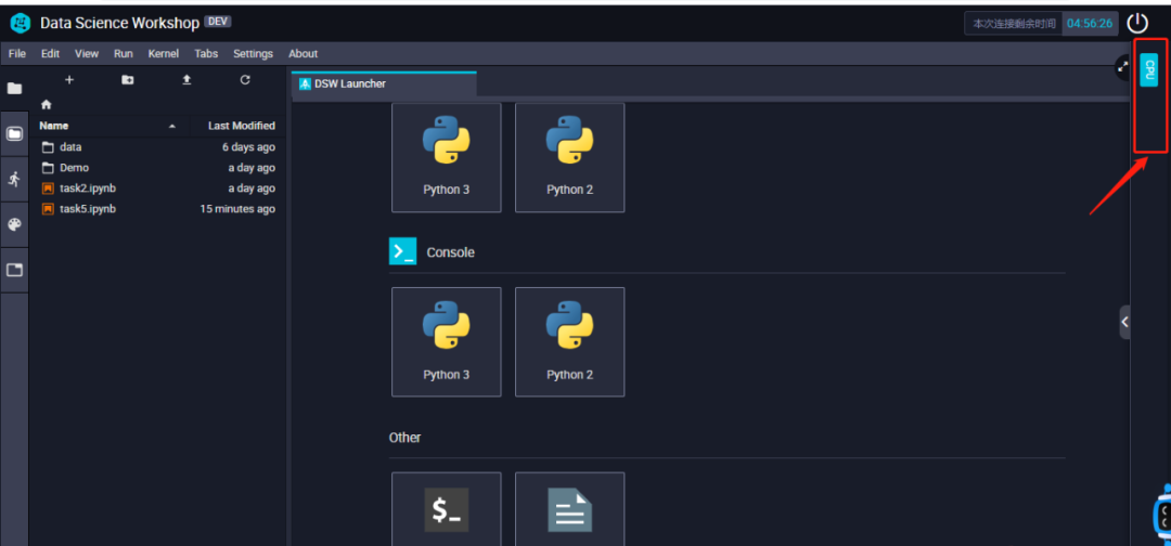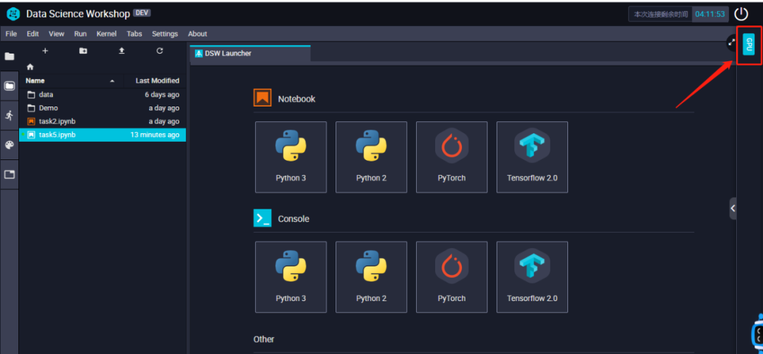 点击红框处按钮即可进入到PAI DSW 实验室了。