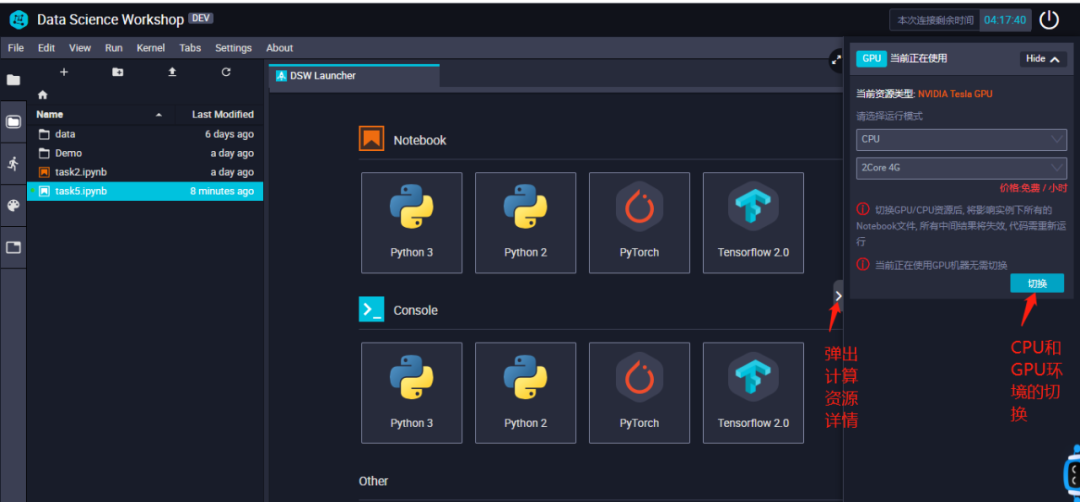 如上图所示,左侧是DSW实验室的⽂件区,在这⾥你可以看到在你的实验室⾥的所有⽂件夹和⽂件。双击⽂件夹即可进入这个⽂件夹。中间是⼯作区,所有被打开的⽂件都会在⼯作区显示出来。右侧是计算资源区域,在这⾥你可以看到你当前使⽤的资源类型。点击右边计算资源区的箭头,即可弹出资源详情,点击切换按钮就可以进行CPU和GPU环境的切换,如下图所示: