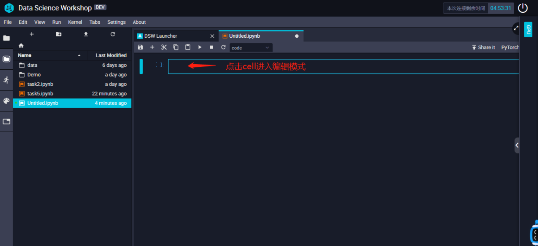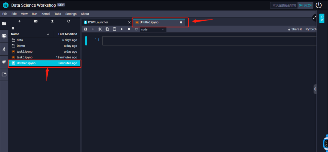 点击了PyTorch这个图标之后,DSW实验室就会⾃动为我们创建⼀个ipynb notebook⽂件。我们在左侧的资源管理器中也会看到。如下图所示: