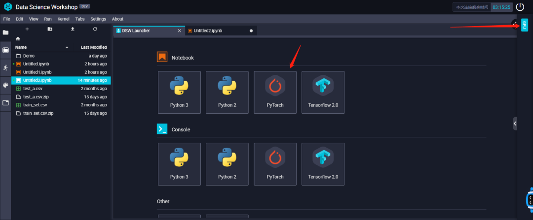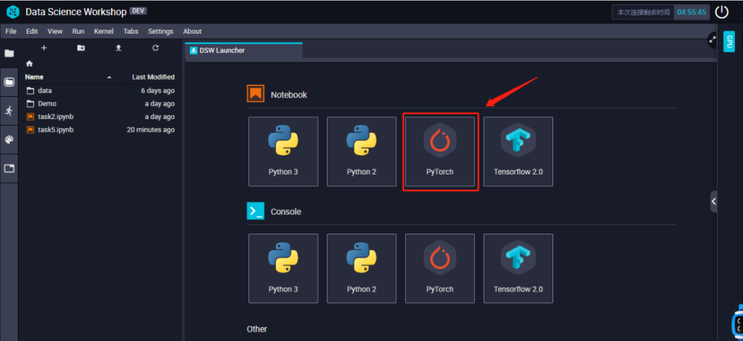 以GPU环境下为例,在工作区默认打开的界面,然后点击Notebook区域中的PyTorch为例,如下所示: