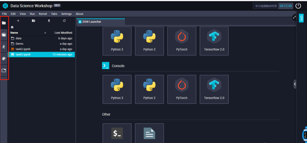 在⽂件夹左侧还有⼀栏Tab,每个图标从上到下分别代表了:⽂件资源管理器,案例代码,正在运⾏的Notebook,命令⾯板,在⼯作区打开的Tab。
