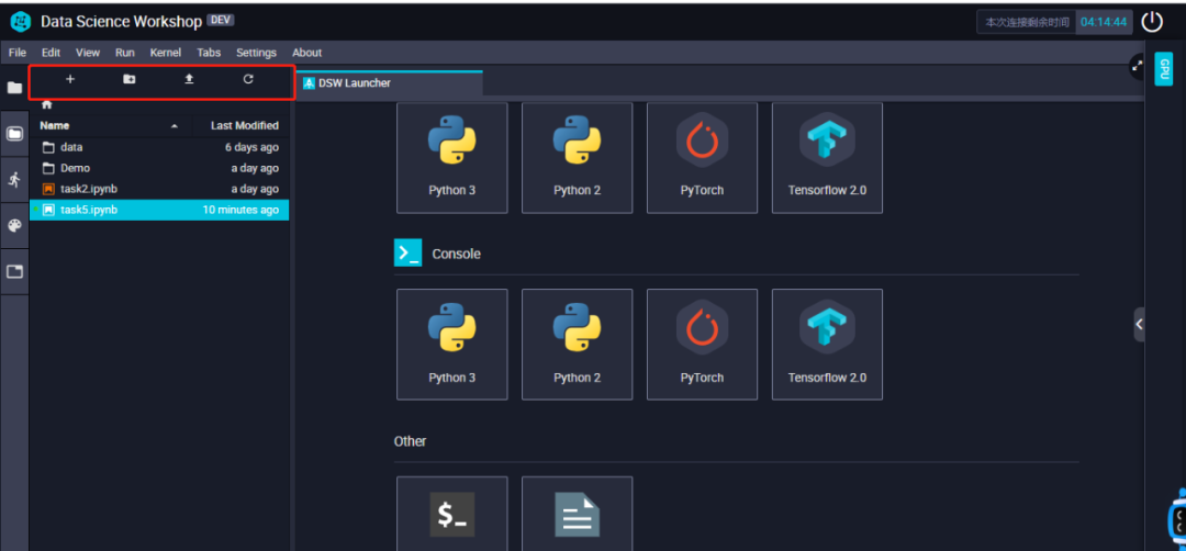 在⽂件资源管理区的顶部还有4个按钮,从左到右分别对应的是:打开DSW Launcher启动器,新建⽂件夹,上传⽂件以及刷新当前⽂件夹。