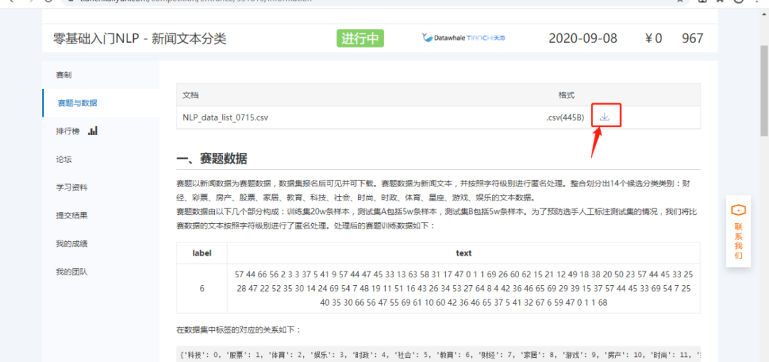 步骤1:首先需要在新闻文本分类挑战赛报名,在赛题与数据栏中,点击红框下载数据。