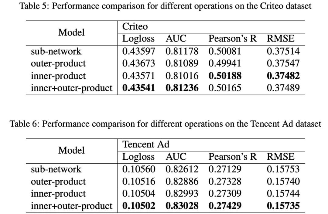 内积操作的效果是好于外积的,内积和外积的组合可以提升模型的效果。