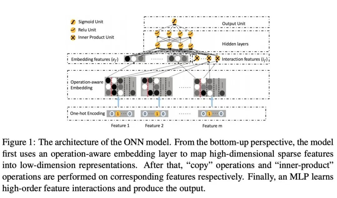 我们发现,“field-aware”是“operation-aware”的一个特例,但是FFM只有内积,而且FFM缺少挖掘深层次特征关联的能力,(ONN的浅层特征和FFM类似).