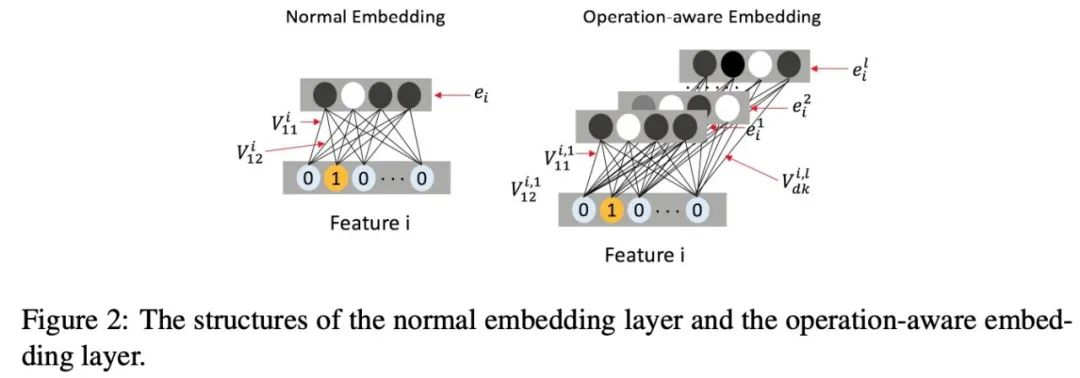 Operation-aware embedding故名思议就是和Operation相关的embedding,一个operation对应一个embedding(注:相同的操作在不同的特征上也被认为是不同的操作),我们发现原先我们的类别特征每次转化为一个embedding向量,想再是个embedding向量,