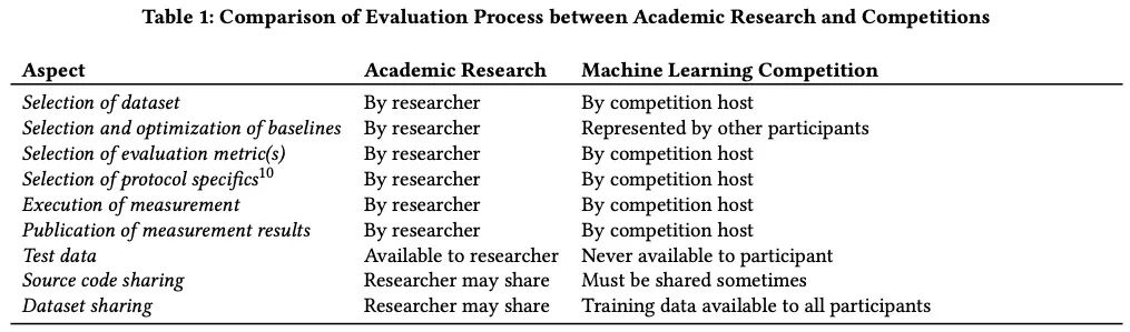 在学术研究和竞赛中,如何设置性能比较实验以及如何实际进行评价是完全不同的。我们在表1中说明了主要差异。