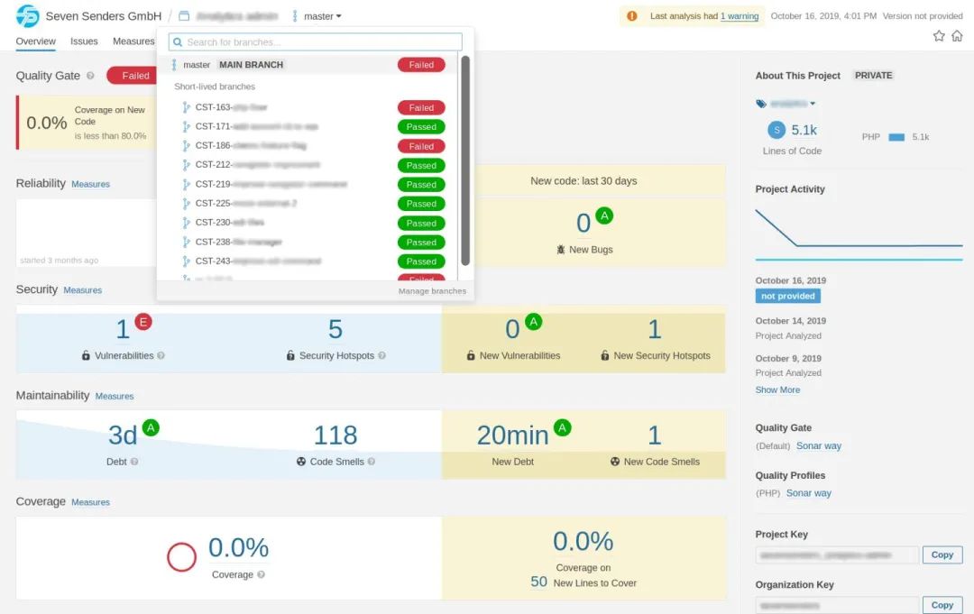 在SonarCloud的页面,你还可以看到更详细的分析,包括bug个数,测试覆盖,安全性,代码重复率等等。