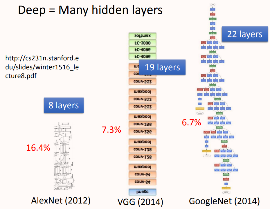 神经网络的连接方式由人工设计,所以可以堆叠很多层神经元构成很“深”网络,如上图所示2015年提出的ResNet就达到了152层的深度。