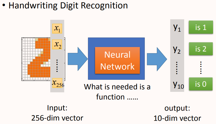 输入:一个16*16=256维的向量,每个pixel对应一个dimension,有颜色用(ink)用1表示,没有颜色(no ink)用0表示,将图片展平为一个256维的向量作为网络输入。