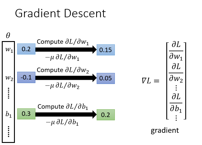 具体流程:????是一组包含权重和偏差的参数集合,随机找一个初始值,接下来计算一下每个参数对应的偏微分,得到的一个偏微分的集合∇????就是梯度,有了这些偏微分,我们就可以更新梯度得到新的参数,这样不断反复进行,就能得到一组参数使得损失函数的值最小。