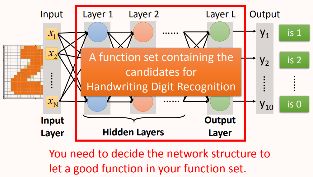 从上图看神经网络的结构决定了函数集(function set),通常来讲函数集中的函数越多越复杂,网络的表达空间就越大,越能handle复杂的模式,所以说网络结构(network structured)很关键。